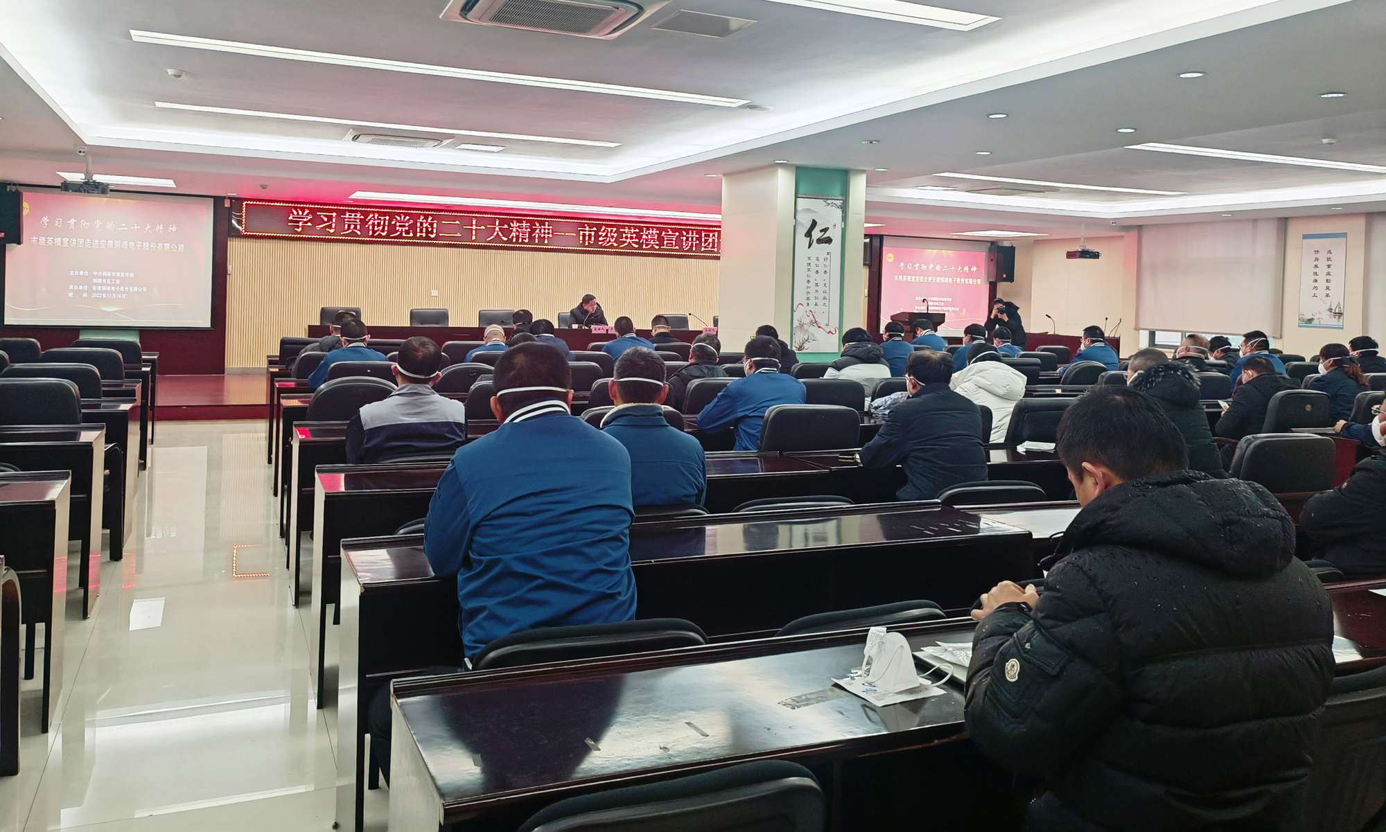 為深入學(xué)習(xí)宣傳貫徹黨的二十大精神,大力弘揚(yáng)勞模精神、勞動(dòng)精神、工匠精神,推動(dòng)黨的創(chuàng)新理論深入人心、落地生根,12月16日下午,由市委宣傳部、市總工會(huì)主辦、公司承辦的“學(xué)習(xí)貫徹黨的二十大精神--市級(jí)英模宣講團(tuán)走進(jìn)銅峰電子”宣講報(bào)告會(huì)在公司辦公樓二樓職教室舉行。會(huì)上邀請(qǐng)全國(guó)五一勞動(dòng)獎(jiǎng)?wù)芦@得者、銅陵金隆銅業(yè)公司技術(shù)主管盧鵬勞模作黨的二十大精神專題宣講。公司黨委書記、董事長(zhǎng)黃明強(qiáng)等公司黨政領(lǐng)導(dǎo)班子成員參加宣講報(bào)告會(huì),公司各黨支部書記、分工會(huì)主席和先進(jìn)模范、新黨員、入黨積極分子、群眾代表等聆聽了報(bào)告。宣講報(bào)告會(huì)由公司黨委副書記潘世宇主持。